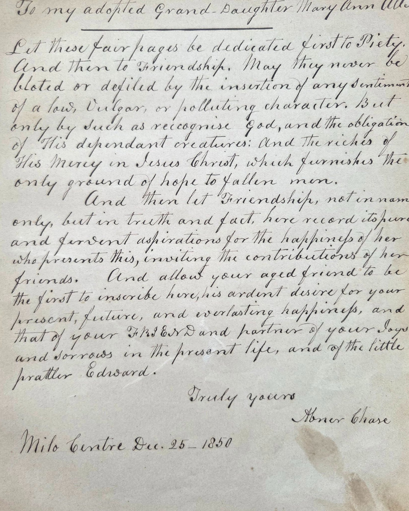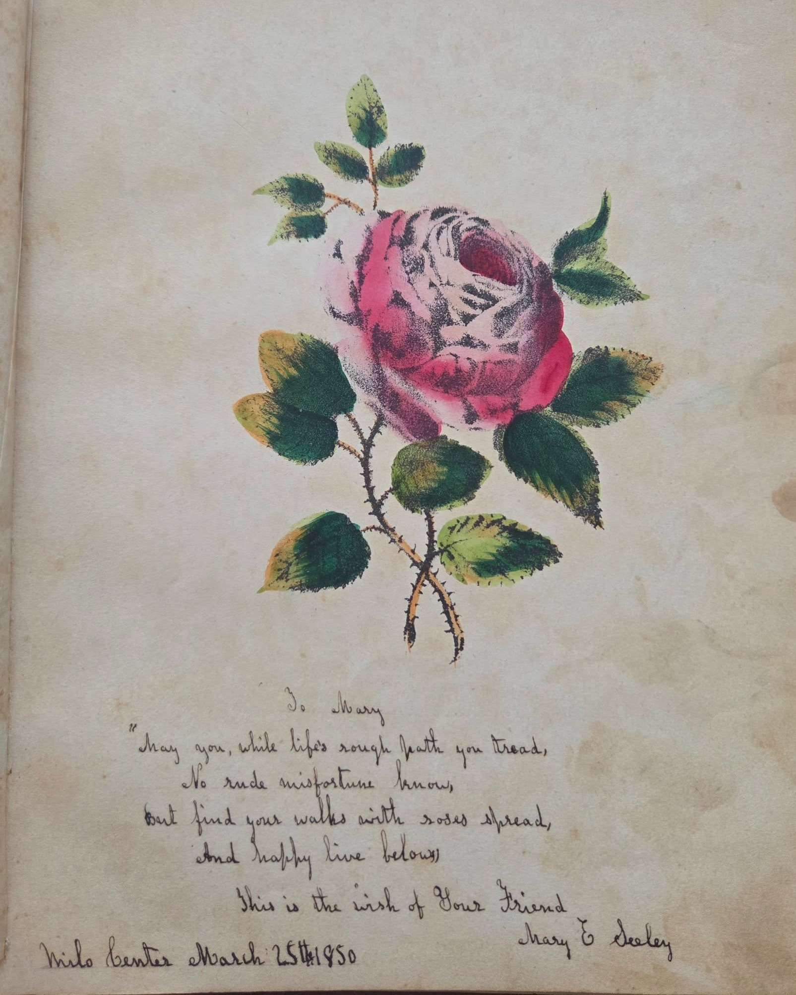 One hundred and seventy-five years ago, on December 25, 1850, Mary Ann Spooner Allen of Milo Center received this autograph book as a Christmas gift from her minister, Abner Chase, of Milo Center Methodist Church. It has a floral theme and features beautifully painted flowers on many of the pages. Autograph books were popular with teenagers and young people in the 19th century. They were usually elaborately decorated and blank inside, to allow the owner to collect poems, advice or jokes from loved ones. It was a way for people to keep treasured memories of each other, especially in a time before easy modes of communication could keep people in touch with one another.